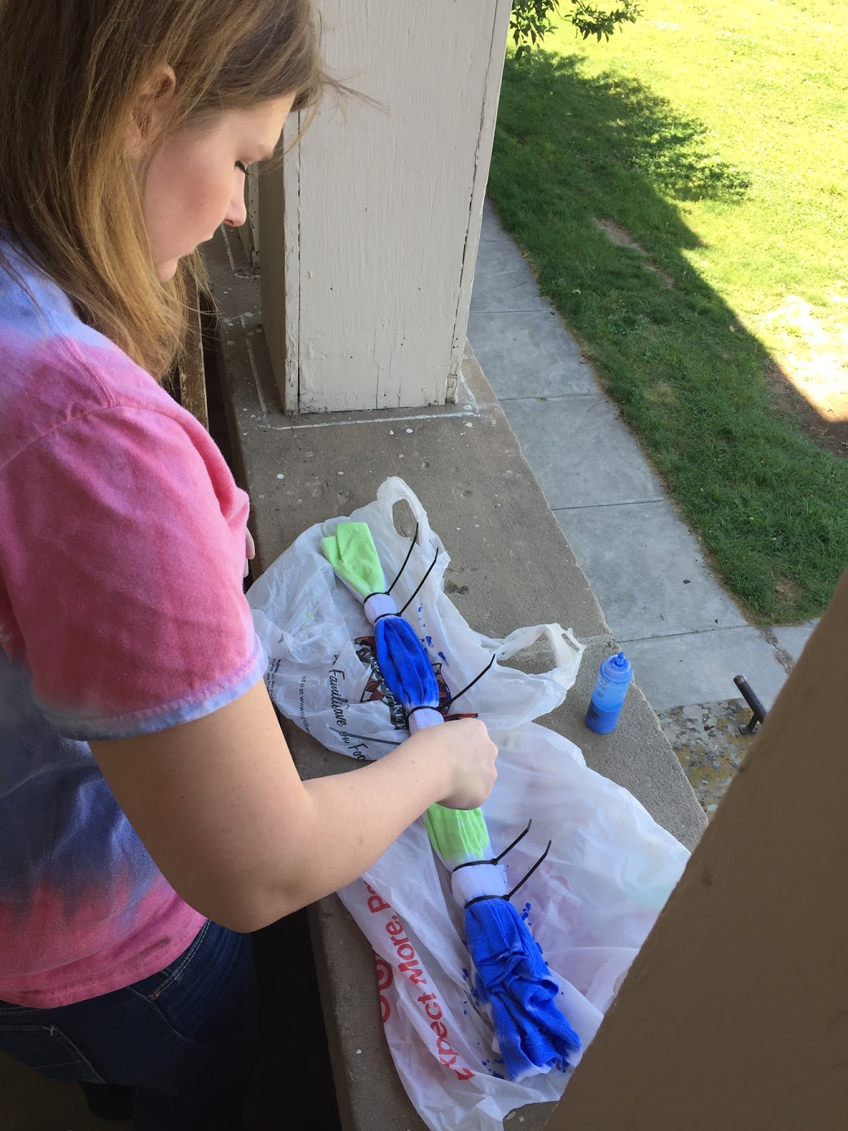 The first morning all together we tie-dyed shirts. It was a little tricky folding them up. I was anxious waiting for them to dry. It took days!